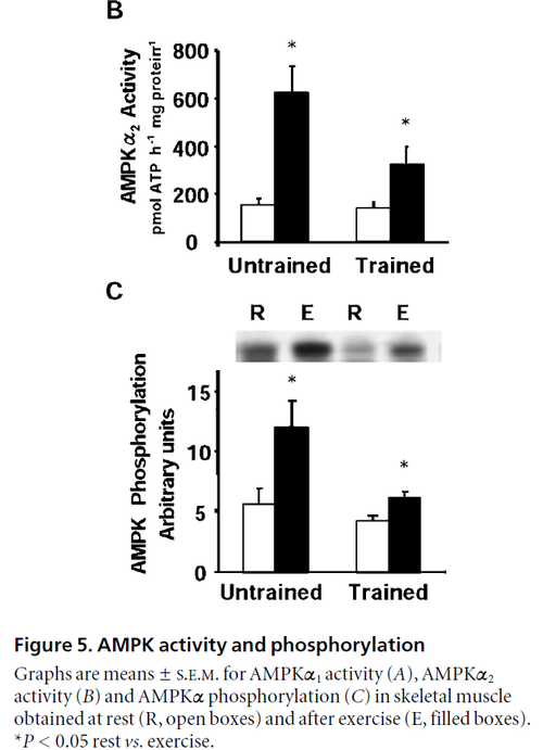 In human long term training can lead to blunted signaling response also (Yu 2003). The AMPKa2 phosphorylation and activity and p38 MAPK phosphorylation in response to cycling exercise undertaken at the same relative intensity was greater in the untrained control subjects than in welltrained individuals, even though the less-trained subjects completed 50 % of the exercise protocol performed by the athletes.